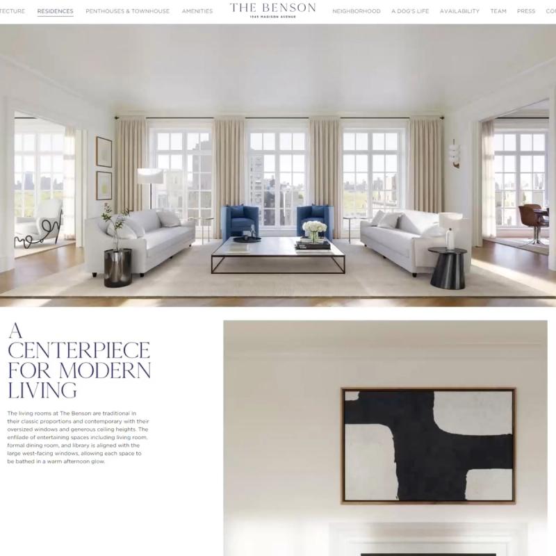We produced a full set of over 30 exterior and interior marketing images for Naftali Group to support the marketing of the building and for use in print and digital collateral. Launched during the pandemic, the images had to work exceptionally hard in an unusually competitive market, to convey the distinctiveness of the apartments to a high net-worth audience.