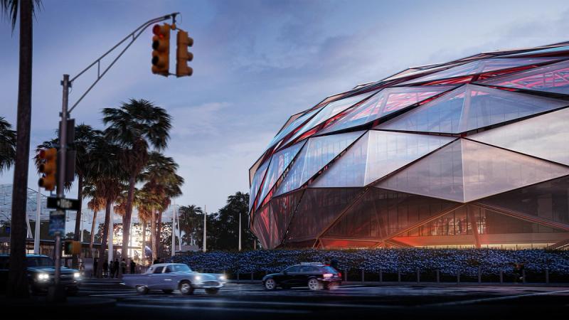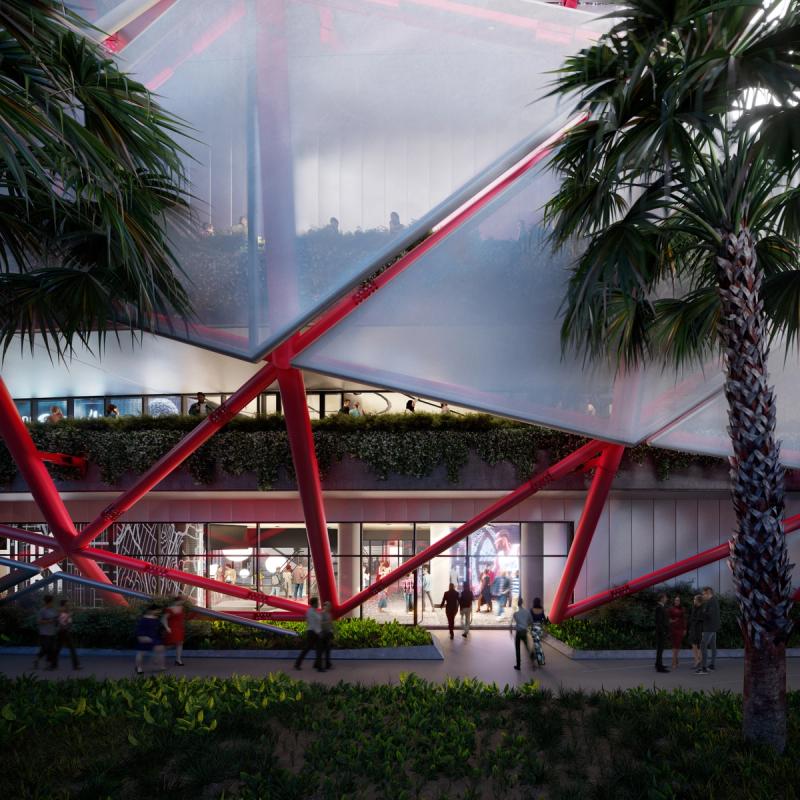 We worked with the project team, led by AECOM’s LA Office, to illustrate a variety of design development options to help the client choose the right finishes for this prominent scheme. A series of façade options illustrated the different effects of using ETFE, metal or PTFE for the cladding, and showed a variety of colours for the support structure, which we showcased by setting it against the beautiful pink sunsets of LA.